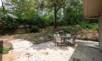 -Back patio with outdoor dining table and chairs in a very private backyard