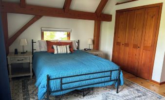 Upstairs you will find two more bedrooms, and a second bathroom with a bathtub, again stocked with important items. The master bedroom includes a king bed, desk, closet and private balcony with table and chairs to enjoy the gorgeous lake view. Should you be staying with us in the cooler seasons, take a seat on the comfortable pull out chair with twin bed to enjoy the view. The second upstairs bedroom provides a queen bed, closet, dresser and a seating area, also with comfortable pull out twin chair.