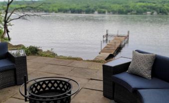 On the bottom floor, you will find the Entertainment Room complete with smart TV, large sectional with queen pull out bed, and plenty of board games for a fun night in. Continue on through the french doors off this room and onto the patio with comfortable outdoor seating surrounding the fire pit, a grill, and access directly down to the private dock and lake front.
