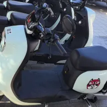 There are electric motorcycles that sit two people for rent and electric cars as well. We scan the QR code on a motorcycle, the rate is ¥54 (49 for 12 hr rent +5 for processing fee), which is about $7.60 usd.