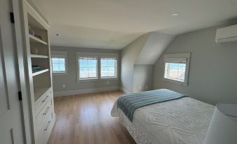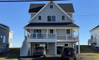 This five bed, five bath beachfront home has tons of indoor and outdoor space to host up to 12 people. Three bedrooms each w/ ensuite on the 2nd floor. Two more bedrooms w/ a large shared bath and very large attic space with a pull out couch on the third floor. All beds are queen size.