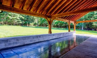 A large timber frame pavilion complete with an outdoor kitchen and bathrooms provides ample space to cook, eat and hang out.