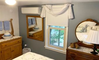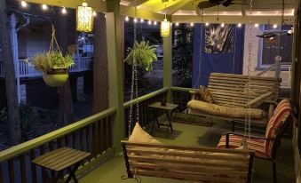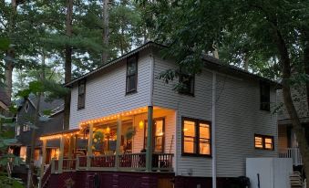 "The Wander-Inn Pines" cottage is perfectly located in the heart of the camp meeting within walking distance to everything "Mount Gretna". This classic Mount Gretna Cottage dates back to 1910 and was originally named Pine Scents. Our cottage offers three bedrooms, one bath, open floor plan, private parking, and an amazing porch. As you Wander through the first floor of the cottage you’ll find the living room with the original rustic hard wood floors. There is an electric fireplace, and a custom bar that opens into the fully equipped kitchen. Continue into the dining area with a coffee and tea station and expandable table that can seat six. Wander up stairs to the second floor and you’ll find three bedrooms, a bath, and washer and dryer. The spacious Master Bedroom has a Queen sized Timber Framed Bed, knotty pine furniture, and glider chair. The Blue Room has a classic feel with a comfy double bed, art deco dresser, and dry sink. The third room hosts a bunk with a twin on top and a double bed on bottom. It has a games cabinet that looks like a dog, and is a perfect place for kids to chill, laugh, and sleep comfortably. The bath has an oversized shower, vanity, and large toilet. There are hooks throughout all the rooms for robes, towels, etc. We provide linens and comfy towels.