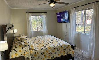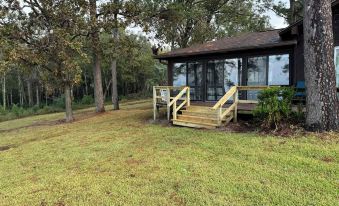 A bright sunroom with large windows offers a peaceful spot to enjoy your morning coffee, read a book, or take in views of the lake. While the sunroom is not air-conditioned, it’s the perfect place to unwind and enjoy the natural surroundings.