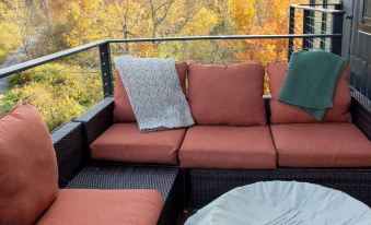 Our kitchen is fully equipped with western sunset views. This full kitchen with an 18 foot counter has state of the art appliances, a direct inline Keurig coffee maker (never have to fill the water again!) All utensils including pots, pans, etc., for those big family dinners or late morning breakfasts. Have your meals together on our very cool dining room table made from a shipping container door! Don’t want to eat in the kitchen? Well there are three deck levels allowing for all kinds of dining experiences including a rooftop deck with propane firepit.