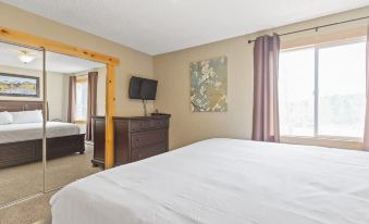 Upon entering this inviting condo, you'll be greeted by two inviting bedrooms and two full bathrooms, ensuring privacy and comfort for up to six guests. The dining area is perfect for family gatherings, featuring a spacious table with four chairs, complemented by three bar stools at the kitchen island for additional seating, or cozy up by the wood-burning fireplace (you are responsible for supplying wood). Furthermore, the in-unit washer and dryer simplify laundry tasks, allowing you to travel light and have fresh clothes at your disposal throughout your stay.
