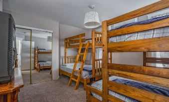 The final bedroom is the largest and includes 2 sets of twin over full size bunk beds, complete with linens and quilts, as well as TV.