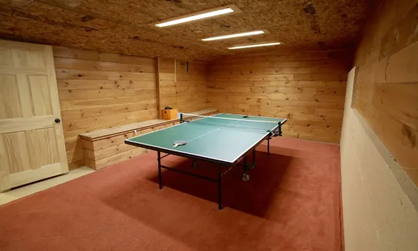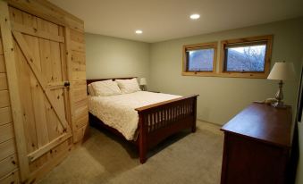 From the main floor kitchen, you can go downstairs to the ground level daylight basement, where you will find the movie room, with comfortable couches and a collection of VHS and DVD movies for family movie nights or just a quiet afternoon. There are also more games and a piano (not in perfect tune, but still quite functional.) Adjoining the movie room is the play room, which has a ping-pong table as well as a collection of toys for younger children. Just past the movie room, there are two bedrooms: one with a queen bed and one with a full bed. There is a bathroom with shower between the two. The ground level has its own outside entrance, as well as a mudroom area with closets to hold your skis and boots, hiking gear, or whatever other equipment you will bring for your trip.