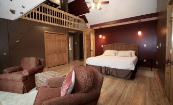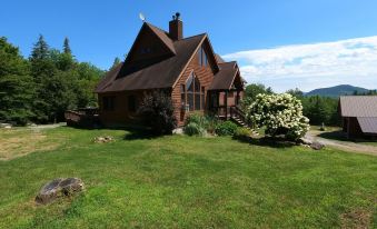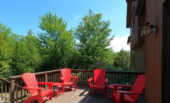 From the entryway, you can head upstairs to the library loft, which has couches and books, magazines, puzzles, and games to entertain your group after a long day of outdoor adventures or if the weather turns bad. This loft overlooks the living/dining room below, adding to the open feel of the main living area. Through the library loft, you enter the master suite, with high ceilings, large windows, a sitting area and a king-sized bed with memory-foam mattress. Grab a book or a cup of coffee, put your feet up and take in the sights and sounds of the brook below. The spacious master bath and its Jacuzzi tub look out at the Jay Mountain Wilderness beyond. Above the master bedroom is a lofted space that has been converted into a bouldering loft, where kids and adults can practice their climbing skills. Attached to the master suite is a small office for anyone who wants to work remotely during their time away.