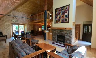 The main entry takes you into the open living/dining area, with soaring cathedral ceiling, large windows, couches and a flagstone wood-burning fireplace. It includes two rectangular tables and twelve chairs that can be arranged in a variety of ways to accommodate your group. The dining area opens onto a deck with a gas grill, Adirondack chairs, a picnic tables for outdoor meals, and a view of the brook. The kitchen is large and well stocked with everything needed to prepare meals for a group. It has an island with a counter and four stools and a large pantry with plenty of space for all your food items, coolers, etc.