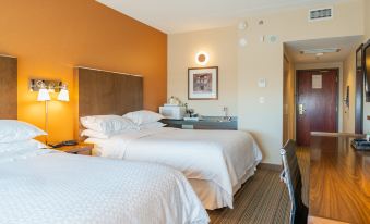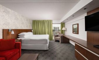 Nice room, great location, very comfy bed! The room we were initially given had a strong smell...it was a pet friendly room, so possibly dog pee. We told the front desk of the issue, and we were immediately given a new room which was great. Very convenient for my husband to walk over to the airport for his early morning flight. We also had dinner at the hotel next door, which is connected by a tunnel...great dinner and we didnt even have to walk out in the rain 😊