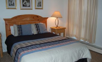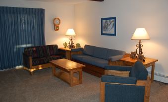 The primary living room features a flat screen television equipped with a VCR/DVD combination, a wood-burning fireplace, complimentary Wi-Fi access within the unit, and a queen-sized sofa bed. Please note that there is no air conditioning available.