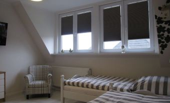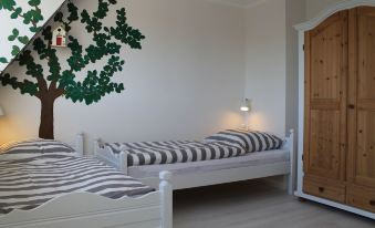 Two single beds and lovingly restored furniture in the dormer room and a double bed (180x200) with a walk-in closet in the north room.