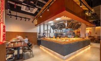 At the intersection of Wuxi's bustling city life and natural poetic charm, we have meticulously created a perfect urban retreat — Floral Hotel·Yingyue Lakeside Inn (Wuxi East Station Branch). Its modern exterior shines brilliantly by the lakeside. Upon entering the inn, the public areas showcase quality and style at every turn. In the lobby, uniquely shaped crystal chandeliers cast dazzling light, paired with wooden elements and greenery to create an elegant and cozy atmosphere. In the bar area, warm yellow lighting complements vintage leather chairs, with a dazzling display of various beverages, perfect for a relaxing drink. In the restaurant, the open dining area is filled with a variety of delicious foods under soft lighting, creating a very pleasant dining ambiance.