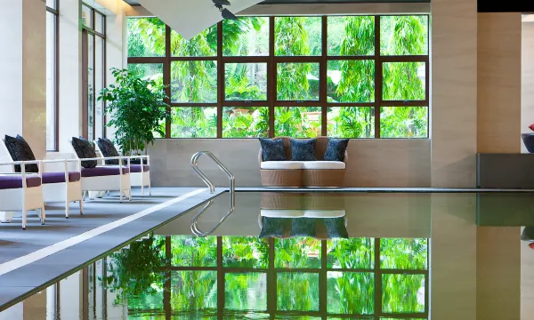 ),--all iconic Xiamen landmarks for trendy and effortless exploration. The hotel commands breathtaking views of the city skyline and the natural lush greenery. The hotel offers a wide range of recreational and culinary delights that include a heated indoor pool, steam/sauna, Gym Spa, outdoor kid playground and scenic jogging trails. Food and beverage selections include an International All-Day Dining and Le Mei, a Chinese restaurant serving Cantonese and regional favorites, Latitude 24 offers a vibrant venue to relax during the day and selections of international wines and cocktails. All guest rooms offer private balconies overlooking the Garden Courtyard or hillsides complemented by exclusive semi-detached villas adjacent to the hotel, villa rooms and suites are split level and with private patios and gardens offering extra privacy and space.