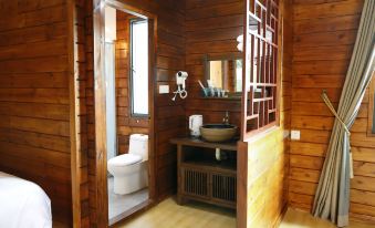 房子臨江,青蓮水和竹子,風景臨窗可得。主要是鋼架木板結構,乾爽舒服,一廳一房,還有臨江露台。老闆和管理大叔熱情泡茶,還有温泉可泡,不錯的體驗