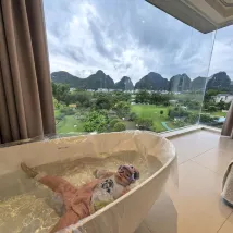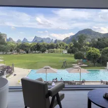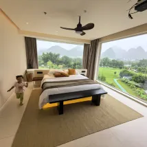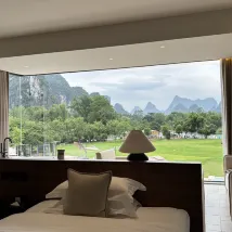 Absolutely breathtaking! On this trip to Guilin and Yangshuo, I unexpectedly discovered this hidden gem right by the Yulong River – the Yuanyuan View Hotel. From the comfort of your bed, you command a breathtaking panorama of mountains and rivers. The expansive 6-meter floor-to-ceiling windows bring the scenery right into your room, making it feel like living inside a traditional ink wash painting – utterly therapeutic!