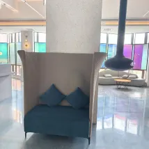 The lobby reception is compact, with drinks and snacks available for self-service.