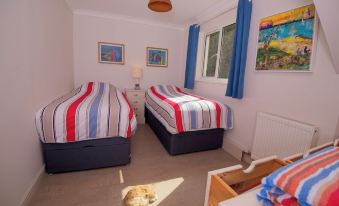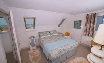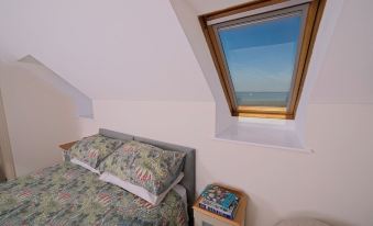 The large master bedroom on the ground floor is the quintessence of quiet luxury, featuring a king-size bed with pocket-sprung mattress, large bay window, and French doors that open directly onto a grassy lawn facing the sea. Step outside with your morning coffee and feel the salty breeze before all but the sailors and seagulls are fast asleep. The en-suite bathroom is designed with a nod to the island's fossil and geological heritage - spacious, with a walk-in shower (both overhead and handle shower heads) and sink/wc cabinets. Also on the ground floor, a twin bedroom with full-size single beds is ideal for adults or older children, with a funky 1970s shower room next door.