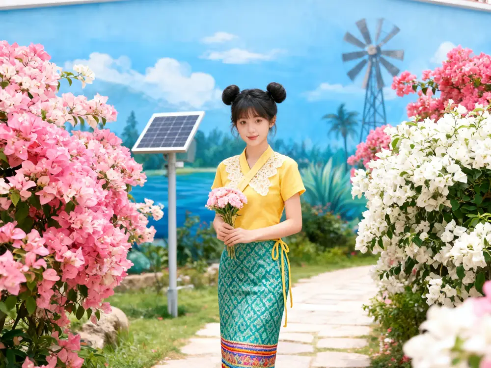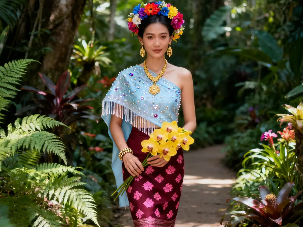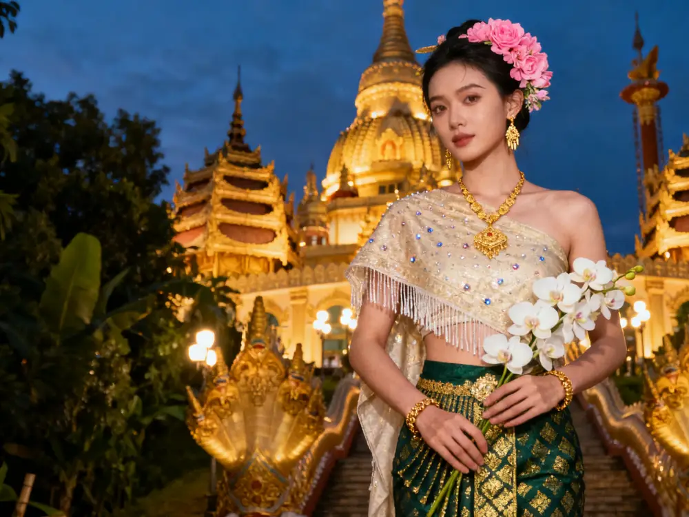 Dressed in elegant Dai attire, you become part of Xishuangbanna’s picturesque landscapes. Pose beneath the golden spires of a Buddhist pagoda, amid lush tropical gardens, or on the veranda of a traditional stilted house. As sunlight filters through palm leaves, your flowing silhouette blends with serene surroundings.