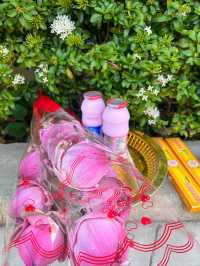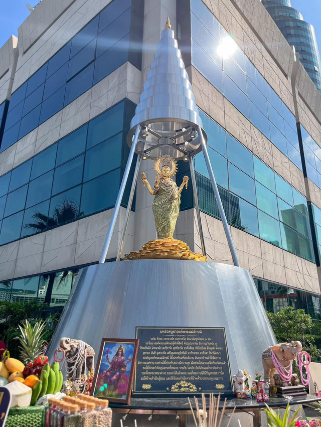 #TravelChat #TravelChat Today's travel chat invites everyone to pay respects to Goddess Lakshmi. My mom will be at the Gaysorn Building. Today, my boyfriend and I decided to dress in pink. We've done our research and learned that Goddess Lakshmi loves the color pink. So, I'd like to invite everyone to join us, in case you haven't been there before. I recommend pink offerings, pink lotus flowers, and wearing pink tones. It's one of the secrets to making a wish. We're sharing this with you in case you want to visit. #TravelPlan