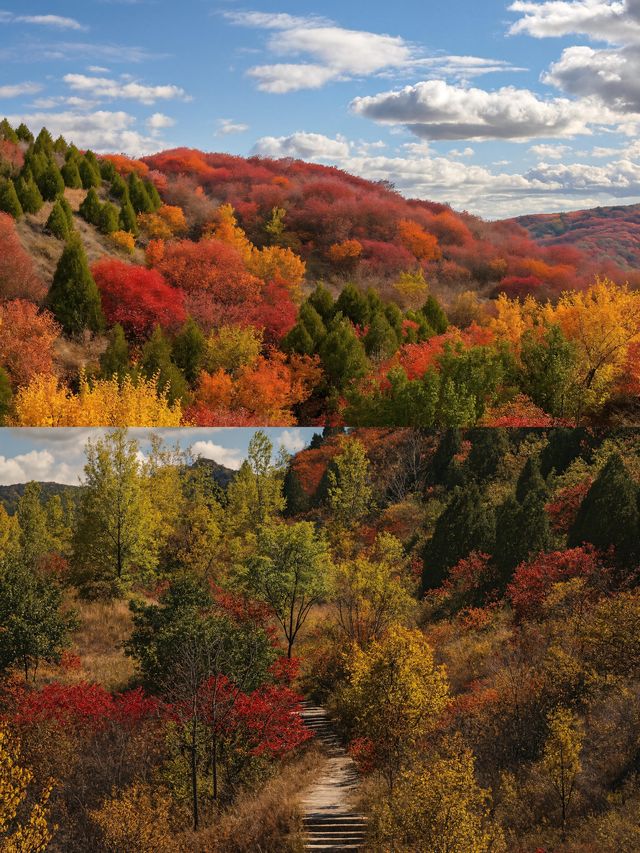- 📍Address: Wucai Qianshan Tourism Trail, Shunyi District, Beijing - 🗺️Navigation: Just search for "Zhonglong Leisure Station" (there’s a free parking lot right at the entrance 🅿️, super convenient) - 🚗Driving route: City → Jingcheng Expressway → Muyan Road → Wucai Qianshan, about 1.5 hours total (usually no traffic on weekdays, smooth drive all the way 🚙) - 🎫Admission: Free! Open to the public (great value for money 💯) - ⏰Best time to visit: Mid to late October to early November (peak colorful foliage, stunning mix of red, yellow, and green) ❤️ Why highly recommend? 3 heartfelt reasons! 1️⃣ An autumn palette live! So beautiful it feels like stepping into a painting 🎨 The moment you step into Wucai Qianshan, you’ll be speechless at the mountain covered in colors 😍! Tens of thousands of acres of colorful leaves blanket the hills—fiery red from Chinese sumac, gentle orange from yuanbao maple, bright yellow from ginkgo, pale golden from ash trees... Dozens of colors intertwined 🔥. When the wind blows, leaves rustle, sunlight filters through branches casting dappled shadows 🍃. The whole valley looks like a spilled palette, every step is wallpaper-worthy scenery, and every snap is a cinematic shot 📸~ 2️⃣ Friendly for beginners, families, and pets! Easy stroll with no stress 🐾 Unlike other steep mountains, the trail at Wucai Qianshan is very gentle 🚶. Even those who don’t usually exercise can leisurely walk the entire route. Kids can run freely, and pets can roam happily 🐕. My dog chased fallen leaves all the way, joyful like a little cannonball. Seeing that, my mood brightened instantly~ 3️⃣ 1 hour escape from the city! Fewer crowds, beautiful scenery, and free 💰 No need to wake up early or squeeze through crowds. In just 1 hour, you can switch from the noisy city to a natural oxygen bar 🌿! No admission fee, free parking, avoiding the crowds at Xiangshan and Pofengling, while fully immersing in autumn romance. Great value for money, truly the “autumn salvation” for Beijing workers 😌~ 🍂 Immersive mountain stroll | Unlock autumn healing vibes Wucai Qianshan is definitely a hidden autumn treasure for Beijing locals ✨! Over 50 tree species create a colorful painting from the foot to the ridge, every step reveals a new surprise~ Walking slowly along the trail, soft fallen leaves underfoot, the rustling of leaves in the breeze 🍃, fresh scent of plants in the air. Climb to the boardwalk viewing platform for a distant view—layers of red leaves covering the mountain like blazing flames 🔥. Sunlight on the red leaves glows gently, healing all fatigue, leaving only comfort and relaxation 😌~ Whether sitting in a mountain pavilion daydreaming, having a picnic with family and friends 🍱, or strolling slowly with pets, every moment here is filled with autumn’s warmth and romance~ 📝 Practical Tips | Must-read before you go! 1. ☀️ Don’t slack on sun protection: UV rays are strong on the mountain, be sure to bring hats, sunglasses, and sunscreen spray to avoid getting sunburned~ 2. 🥤 Bring supplies in advance: No shops along the way, so bring plenty of water and snacks (chocolate and energy bars are perfect) to replenish energy and satisfy cravings 😋~ 3. 🧥 Dress wisely: Big temperature difference between morning and evening, recommend easy-to-remove outerwear (windbreakers, sweatshirts work well); choose warm colors (beige, caramel, reddish brown) to match the autumn scenery and look great in photos 📸~ 4. 🍱 Picnic is super cozy: There are many clean pavilions on the mountain, bring a picnic mat and snacks for a perfect autumn forest picnic with great atmosphere~ 5. 🐕 Pet tips: Although pet-friendly, always keep pets on a leash and bring a water bottle for them to stay hydrated~ 📸 Photo guide | Easily capture stunning autumn shots - ⏰Best time: 9:00 AM to 3:00 PM (soft light makes the colorful leaves more vivid and the shadows beautiful) - 💃Recommended outfit: Warm-colored clothes + light-colored scarf/hat (adds layers and creates a gentle contrast with red leaves) - 📍Must-visit spots: - Ridge trail: Overlook the colorful mountain with a wide view - Boardwalk viewing platform: Perfect for panoramic shots, capturing the valley with red, yellow, and green leaves - Colorful leaf valley bottom: Get close to the red leaves, fallen leaves cover the ground, full of atmosphere Autumn in Beijing is short, don’t hesitate anymore 😆! Take advantage of the beautiful sunshine, drive just 1 hour to Wucai Qianshan, and pack all the romance and healing of the red leaves into this autumn~