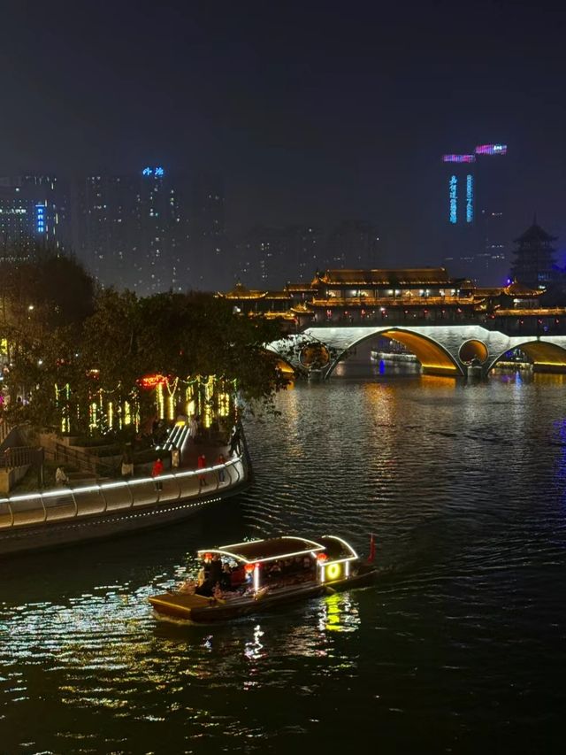 Anshun Lang Bridge Night View, Chengdu, Sichuan | A Thousand Years of Light and Shadow Along the Jinjiang River As dusk falls, the lights on both sides of the Jinjiang River gradually illuminate. At this moment, Anshun Lang Bridge bathes the water in a dazzling display of color. Its simple structure gleams with the light, resembling a golden dragon resting peacefully on the river. The bridge's eaves, the exquisitely carved railings, stand out against the night sky. Red lanterns hang high, their reflections blending with the rippling water, suffusing the entire Jinjiang River with a warm glow. Originally a Ming Dynasty structure, Anshun Lang Bridge has undergone numerous restorations and is now both a landmark of Chengdu and a living piece of history. Walking along, the murmuring of the river echoes in the ears, while before one's eyes, a scene intertwined between modernity and antiquity unfolds. Some rest on the bridge, some take photos; many more simply lean on the railings, observing how this city seamlessly blends the past and the present, prosperity and tranquility.