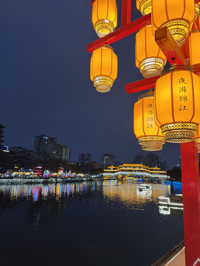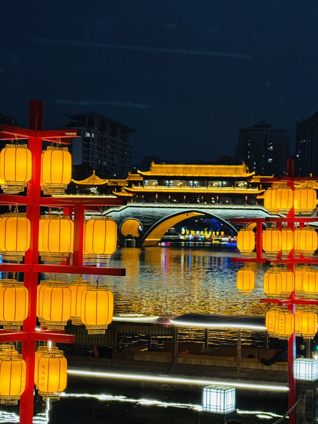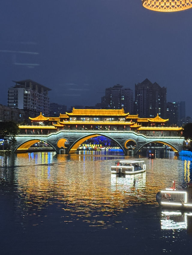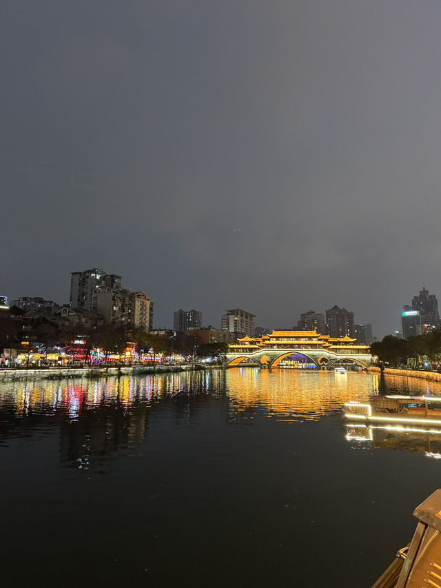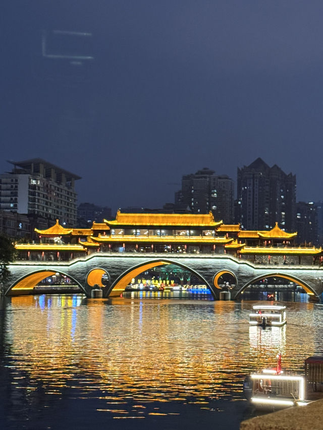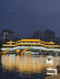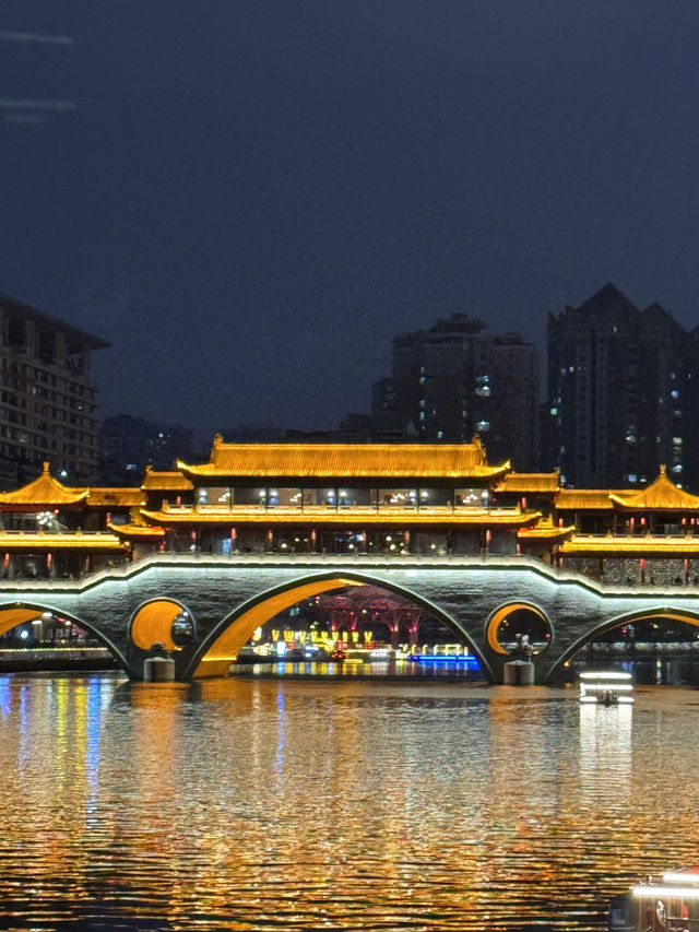 Anshun Lang Bridge Night View, Chengdu, Sichuan | A Thousand Years of Light and Shadow Along the Jinjiang River As dusk falls, the lights on both sides of the Jinjiang River gradually illuminate. At this moment, Anshun Lang Bridge bathes the water in a dazzling display of color. Its simple structure gleams with the light, resembling a golden dragon resting peacefully on the river. The bridge's eaves, the exquisitely carved railings, stand out against the night sky. Red lanterns hang high, their reflections blending with the rippling water, suffusing the entire Jinjiang River with a warm glow. Originally a Ming Dynasty structure, Anshun Lang Bridge has undergone numerous restorations and is now both a landmark of Chengdu and a living piece of history. Walking along, the murmuring of the river echoes in the ears, while before one's eyes, a scene intertwined between modernity and antiquity unfolds. Some rest on the bridge, some take photos; many more simply lean on the railings, observing how this city seamlessly blends the past and the present, prosperity and tranquility.