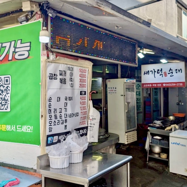 Segadok Soondae is located in a corner of the Yukgeolli General Market, which is bustling with locals. I went to this popular restaurant for breakfast, where people who work in the market come to eat from early in the morning. I ordered 따로국밥 (Ttaro Gukbap). Rice and soup are served separately. You can choose from the following soups: ・Sundae + innards ・Sundae only ・Innards only If you don't say anything, you will get Sundae + innards. The innards are made from various parts, each with a different texture and no unpleasant smell, and the Sundae was delicious. The kakteok on the table was also so delicious that I had to have seconds. I added some tadaegi halfway through to make it spicy, and at the end I added rice to make it a soup. It's nice to be able to enjoy the different flavors over and over again. The restaurant is spacious, so I think it's easy to go in alone. Come join the locals and experience the local atmosphere. We also recommend strolling through the expansive Yukgeolli General Market! ▪️ 새가덕순대 (Segadoksuundae) 142 Nammun-ro 1-ga, Sangdang-gu, Cheongju-si, Chungcheongbuk-do 043-254-2739 6:00 AM - 9:00 PM #Cheongju #CheongjuGourmet #YukgeolliGeneralMarket