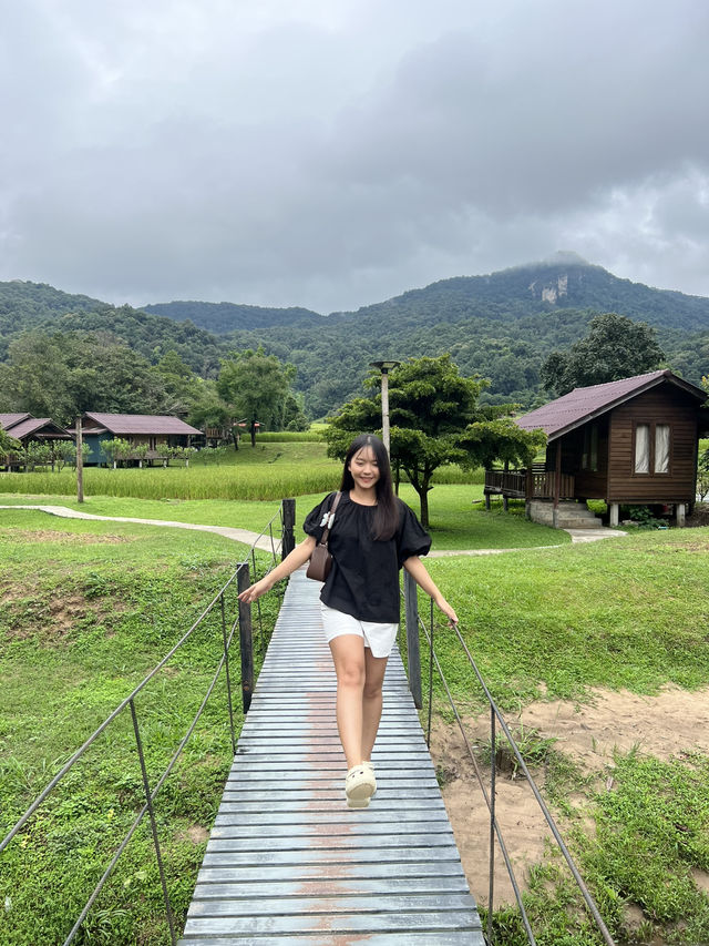 🏡 Baan Klang Luang Hill is absolutely stunning! The atmosphere during the rice farming season is the best! The view is stunning, with mountain views in front. And a stream behind, where you can jump in and play in the water. Absolutely amazing! But in winter, the water is freezing cold. ⛰️🏔️ We went in October, and the weather was perfect. There was some rain, but the weather was cool. In the evening, we ordered the resort's grilled pork. We had a family barbecue and enjoyed the barbecue. 👍 It's so quiet and chill here. The owners are lovely and friendly. I'll definitely go back. This is another place in Chiang Mai that I highly recommend to everyone. 😊 #GetDiscountsWithoutLuck #VisitChiangMai #ChiangMai