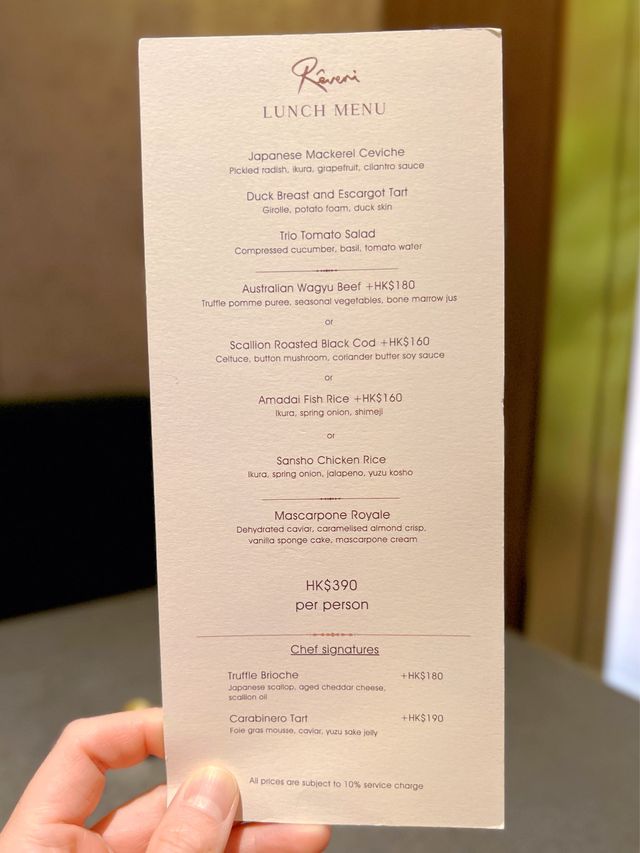 This French restaurant is located near Sheung Wan MTR Station. It specializes in Fine Dining and combines Asian flavors with Western cooking styles. The environment inside the restaurant is elegant and comfortable, and the open kitchen allows you to appreciate the chef's craftsmanship. . The waiters were very hospitable and would change the tableware before each dish was served. They would also introduce each dish. . 📍Lunch Menu - $390/1 . 🔸Japanese Mackerel Ceviche The mackerel sashimi is rich in fat, the fish meat is delicate and tender, marinated with refreshing ceviche, with a little sweet and sour grapefruit meat and crisp salmon roe, accompanied by coriander sauce, so light. . 🔸Duck Breast and Escargot Tart The golden and crispy tart is wrapped with tender duck breast and snails, and the chanterelles have a distinct apricot fragrance, and the dense potato foam adds a smooth texture. . 🔸Trio Tomato Salad The salad is made from three different types of tomatoes, with rich tomato juice and basil herbs, which is very refreshing and appetizing. . 🔸Amadai Fish Rice +$160 A large piece of sea bream with grilled scales, the tender fish meat is rich in fish fat, the fish scales are fried thin and crispy, and there are salmon roe, sea urchin and Japanese mushrooms to enhance the flavor. The rice in the kamada is slightly burnt and very delicious. or 🔸Australian Wagyu Beef +$180 Two pieces of Australian Wagyu beef are evenly fat and juicy, topped with beef bone marrow juice, the meat is very rich in flavor; the dense and delicate black truffle puree exudes a fragrant aroma, and there are also seasonal vegetables such as corn cobs and asparagus. . 🔸Mascarpone Royale The golden and crispy cookie tart is rich in butter aroma, with caramelized almonds inside, rich Mascarpone cream with sweet and caramel aroma, and fresh caviar, and the soft vanilla sponge cake balances the greasy feeling. --------------------------- Rêveri Address: G/F, Kam Tak Building, 20-24 Ma Sha Street, Sheung Wan Phone: 67787278 #hkfoodie #hkfood #hkrestaurant #hkfoodblogger #hkdaily #foodrecommendation #hongkongfood #hkgoodplaces