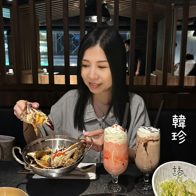 Over the weekend, my friends and I went to Han Jam Restaurant in Tsim Sha Tsui in Po Le Lane for Korean food. The restaurant is simply decorated, with black and gray and wooden strips as the main tone, very Korean, full of space comfortable seating, exhaust system is good. After arranging seating, the staff will hand you ten appetizers, including spicy octopus 🐙, sausage, kimchi, sprouts, etc., which is very refreshing after eating. 🦀Sauce crab with butter rice $348 The whole sauce crab has been removed for easy consumption. The sauce crab is freshly pickled, so it won't be too salty or fishy when eaten empty. The yellow crab paste is fresh and sweet. The butter rice is already very fragrant with rice and egg yolk. Put the rice on the crab lid. The salty aroma of butter rice is accompanied by the freshness of crab paste. Large bowls of rice are quickly cleared. Sauce crab is indeed a white rice thief! 🧀 Cream Cheese Fondue Chicken $188 This is very surprising and delicious 💯👍🏻 The chicken in cheese fondue is served on an iron plate. The chicken is soft and tender. A large amount of cheese does the effect of threading, while eating still keep the heat will not be a piece, the chicken pieces on the juice sour, with cheese is simply invincible, cheese lovers must eat! 🍜Kudzu Cold Noodles $88 The water-cooled noodles are ice-cold and refreshing! The noodles are smoky and tough, the soup is sweet and sour, and the ingredients include carrot slices, cucumber slices, beef shank and egg. After eating cheese chicken, eating water-cooled noodles can definitely relieve your thirst! 🍫Chocolate Whirlpool Smoothie/🍓Velvet Strawberry Smoothie $38 It looks beautiful! The chocolate and strawberry are rich and moderately sweet, and the cream makes them smoother! 🍨Korean Handmade Ice Cream (Grapefruit/Muggle) The homemade Korean handmade ice cream is smooth and delicate, with fresh grapefruit flavour and rich Magli wine, which is the perfect ending to this meal. 📣📣📣 Discount for everyone Now just follow @hancham.official IG to get a new Korean handmade ice cream for you to eat, remember to show it at the restaurant 🫶 📍Han Jane (Po Le Lane) (Tsim Sha Tsui) @hancham.official 1/F, Ying Fung Building, 6-8A Po Le Lane, Tsim Sha Tsui