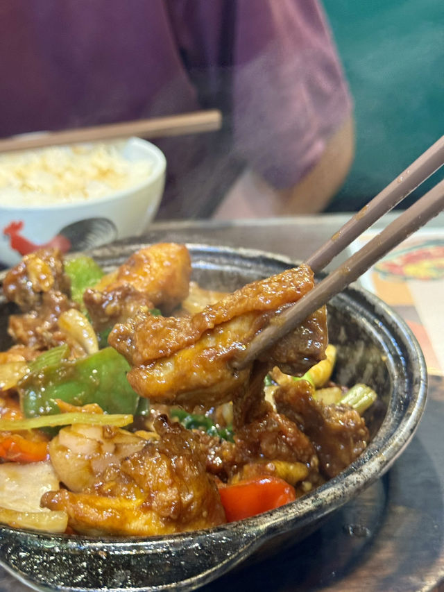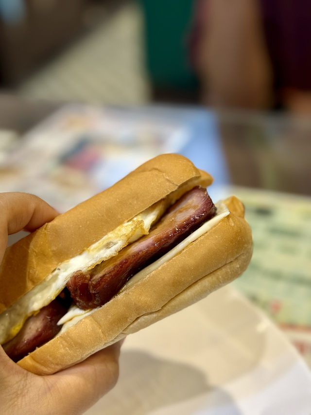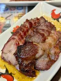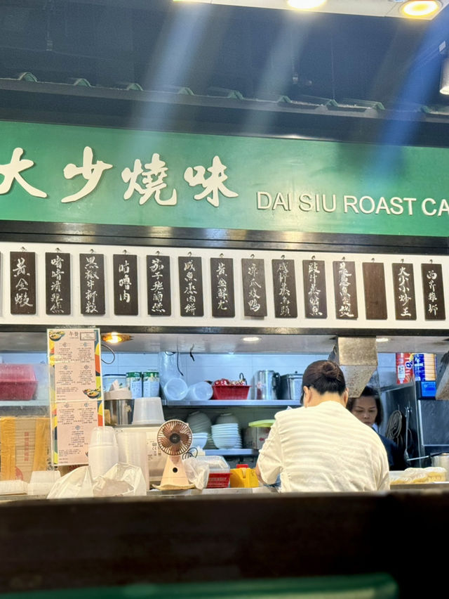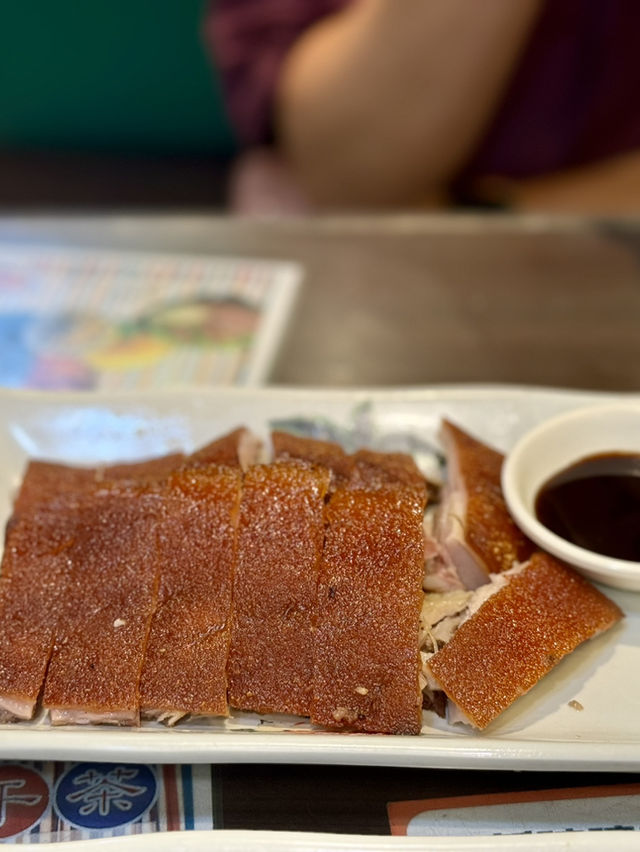 After watching the movie in Kowloon Walled City, I went to Yat Tung Market to take pictures 🤳 and had a casual meal before going home. Near the exit of the newsstand, you can see a "Dai Shao Grilled Tea House" with golden fonts. The window is full of roast duck and roast chicken. As soon as you step into the restaurant🍴, you feel like you are back in the 1980s and 1990s. The green and white nostalgic floor tiles, murals full of Hong Kong elements (Kai Tak Airport, jewelery shop, etc.) open water bar with straight-hanging menu, colorful staircase cylinders, and booth seats. The restaurant is bright and clean, clean and hygienic. It specializes in open-oven barbecue. It has its own factory. Of course, we have to order barbecue. Char siu: moderately fat and lean, semi-fat and lean char siu is the best! The outer layer is caramelized, full of caramelized honey, and the caramelized crust adds layering to the palate. The inside is soft and juicy, when you bite it will not feel gluten, but very soft, oily color evenly, a part with a little fat half fat lean with a bite but also very soft. Suckling pig: is the favorite sesame skin instead of glass skin, with fierce fire the pork extremely quickly cooked, grease due to high temperature and burst open, forming dense bubbles, loose in the mouth, it is indeed the best, but also dipped in the appropriate amount of suckling pig sauce, increase sweetness to solve the greasiness, crispy outside and soft inside, not too salty, just right, can not stop eating. Da Shao Submarine: Fluffy and hot toasted submarine long bun, full of butter flavor, then sandwiched with homemade honey semi-fat lean char siu plus semi-melted cheese, overflowing sun egg sauce, a bite, full of layers, it is a must-order in the restaurant! Jelly Dried Onion Smooth Chicken Pot: sizzling when served, full of hot pan! The chicken pieces are dipped in chicken pot sauce, full of aroma, the chicken pieces are smooth, with lots of onions, green peppers, dried onions, green onions, etc., absorbing the essence of the whole chicken pot, great with rice! Served with white rice: boiled just right, not too dry or too wet, but also taste the rice flavor with the right amount of sweetness. Milk tea uses black and white skim milk, full of milk fat, rich tea base, prominent tea flavor, and not bitter! summary: Must-eat Own workshop barbecue quality assurance Large and small submarines have surprising civilian prices