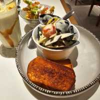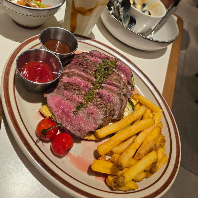 #100 Ways to Travel The last time I shopped was six months ago This time I will have dinner here with my classmates again I heard that there is a good fries here 🥑 Sour Cream Avocado Sauce Fries $55 🍟Sour Cream Works Chips The avocado itself loved it Although said sour cream but mixed with avocado sauce taste just right The fries are skinned - hot and freshly fried, crispy on the outside and soft on the inside White Wine Mussels $79 The cream sauce is so fragrant with garlic wine~ The flesh of blue mussels is plump and smooth The onions are crispy and sandwiched together, which is rich in flavor The toast is crispy and dipped in the cream sauce is unbeatable Main course: Iron Grilled Flank Steak $192 Seven-ripe cut steak ~ pink and pink are very attractive The portion is plentiful ~ cut into meat juice with garlic green sauce is good And there are fries students really love their fries 🍟😜 There are also two side dishes of melons, corn cobs, and cherry tomatoes beverage: 🥤Caramel Crunchy Milkshake $69 The top has a massive amount of caramel crumbs plus cream very wicked, the smoothie is not too sweet The caramel crisps are huge ~ and there is caramel sauce hanging from the cup ~ very evil😈 🍓Strawberry milkshake $55 The sweet and sour taste is very appetizing. I finished it before dessert dessert: Earl Gray Pancake $125 I couldn’t forget it after eating last time~ So encore again this time Earl Gray sauce with fluffy egg-flavored thick pancakes really goes well The figs are sweet and refreshing. They are also served with thin and crispy dishes If not too full really want to try the tiramisu flavor This time I'm sitting on the sofa The clerk was as nice as before