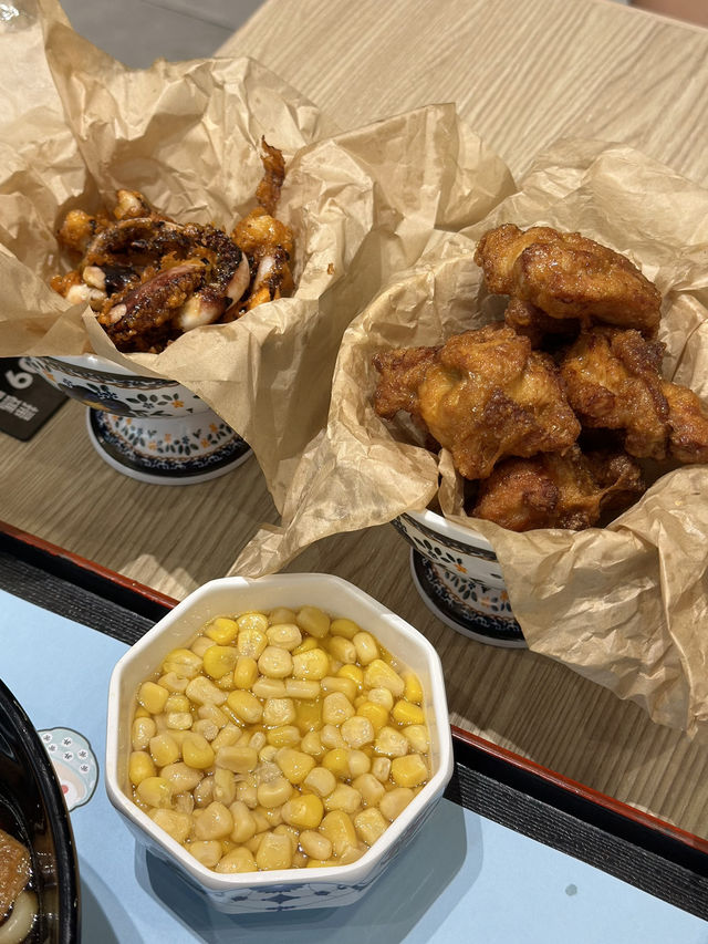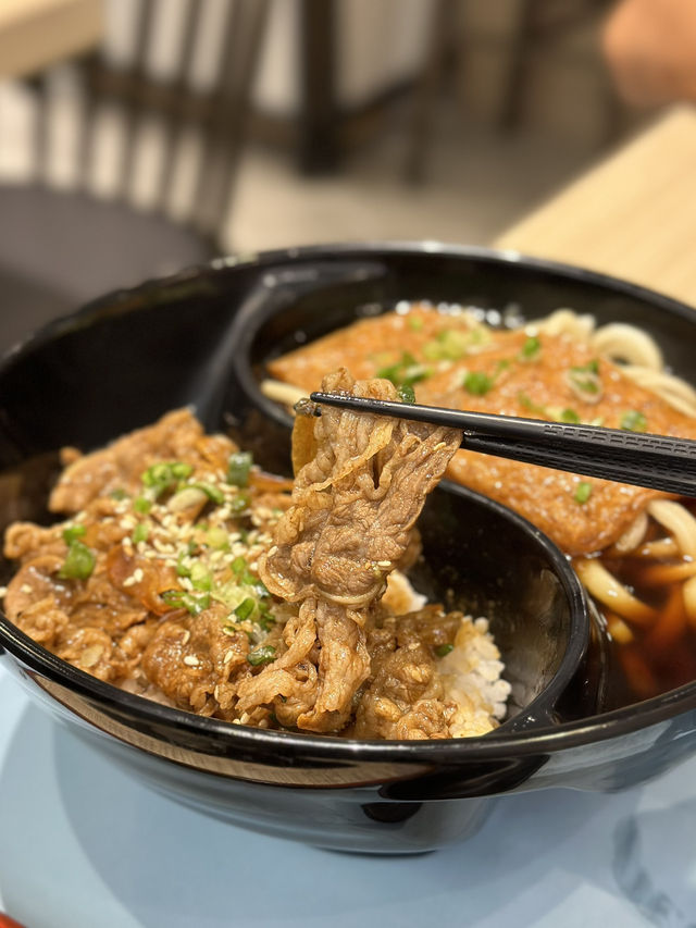 There are several eateries on the 5th floor of Sheung Shui Plaza. I went to Eidon for dinner. The restaurant specializes in Japanese cuisine, offering donburi, udon, and fried snacks. The prices are reasonable, and the taste is quite good! 🔸Onsen Egg Caramel Pineapple Cheese Beef Burger Donburi $72 There are two large, thick hamburger patties, bursting with juicy flavor. One even has cheddar cheese, making the taste richer! The donburi also comes with an onsen egg and a slice of caramelized pineapple, with a generous portion. 🔸Beef Donburi + Inari Soup Udon $73 Indecisive me chose this combo, which includes both beef donburi and udon. The udon has a chewy texture, and the soup base is quite flavorful. The beef donburi portion is also generous, and the rice mixed with the sauce tastes even more delicious. 🔸Karaage Fried Squid Tentacles $33 / Karaage Crispy Fried Chicken $33 / Buttered Corn Kernels $16 The fried items here are made to order. The squid tentacles have a perfectly balanced batter thickness, and the fried chicken pieces are juicy! The corn kernels are full of buttery aroma, making them a great snack choice. 🍴Eidon 📍Shop 502B, 5th Floor, Sheung Shui Plaza, 39 Lung Sum Road, Sheung Shui Sleep Staff