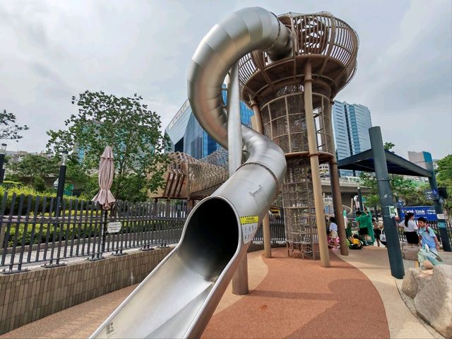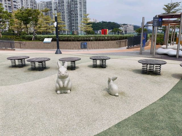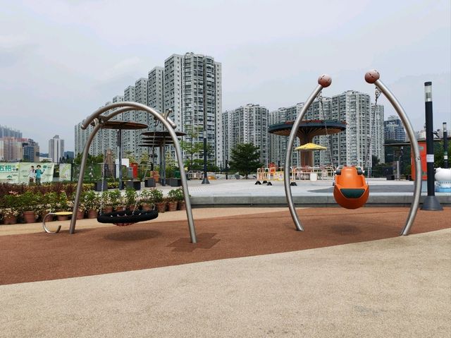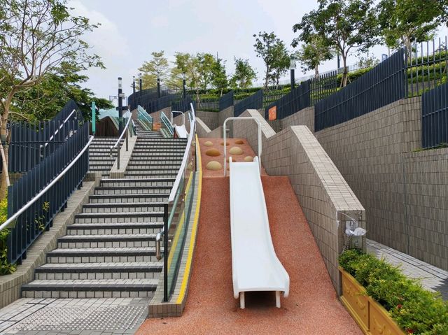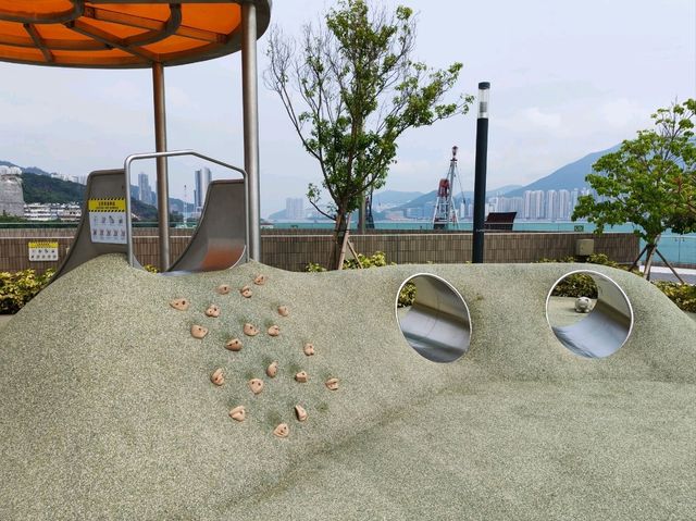 Address: Saikok Wan, Kwun Tong, Kowloon Opening Hours: 07:00 - 23:00 Admission: Free Cha Kwo Ling Waterfront Park is located in the Kwun Tong District. The waterfront garden covers an area of about 1.8 hectares and features a waterfront space and a scenic platform. The scenic platform is situated on top of the Kwun Tong Sewage Pumping Station and is divided into 5 major zones. Designed with the concept of "Fun Nature," it offers 15 play experiences and over 60 sets of play facilities. The 5 major zones are: 1. Earth and Air This is both a viewing platform overlooking Victoria Harbour and a stage for children to engage in social role-playing games. From the highest spectator seats to the lowest platform, you can walk, climb, slide, or of course, sit down and rest. 2. Air and Earth Composed of grassy hills, windmills, and small huts, this area creates a peaceful and comfortable environment. Toddlers, accompanied by adults, can embark on little adventures among the bushes at any time. 3. Sky and Earth Children can jump on trampolines and bouncing discs, leaping from the ground into mid-air, or use the "Whispering Ear" to capture the sounds of nature at unusual heights. 4. Sunshine Sunlight shines through colorful shade canopies, forming a rainbow-like corridor to welcome visitors, allowing children to play with light and shadow. 5. Water and Sky Climb up the treehouse or the tree platform to overlook the garden view, then slide down from a height to splash in the water, letting children fully engage all their senses. This place is perfect for bringing kids to burn off energy.