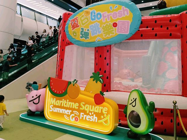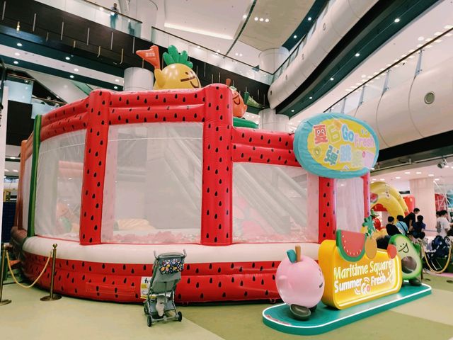 #August2025 #NewTerritories #Tsing Yi #MaritimeShopping #Parenting #Summer Vacation #Where to Go Maritime Shopping's Go Fresh Summer Bounce Park is a colorful and fun place for families to cool off during the hot summer months. The fruit-themed park features numerous large inflatable bubble rides, including a strawberry obstacle course, an avocado ramp, a watermelon bubble pool, and an orange bounce pool. During the summer, the park, located in the heart of the shopping mall, attracted many families, who enjoyed the fun, laughter, and screams, creating a lively atmosphere.