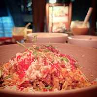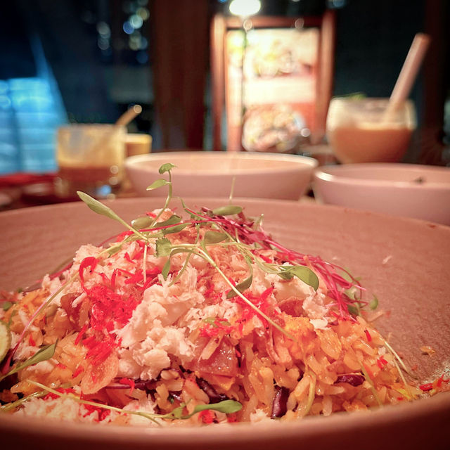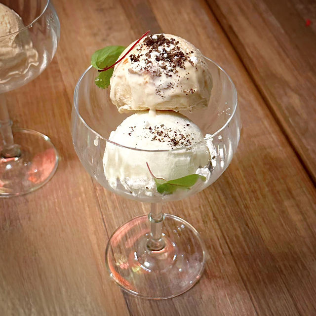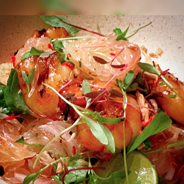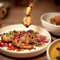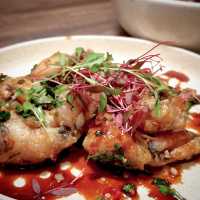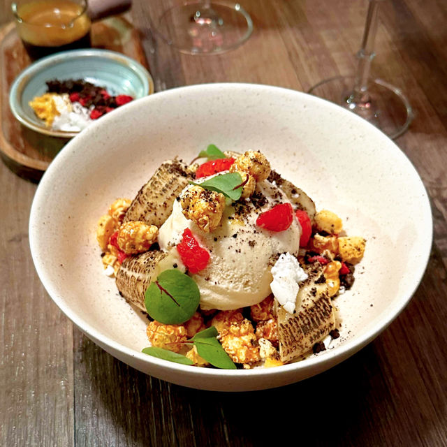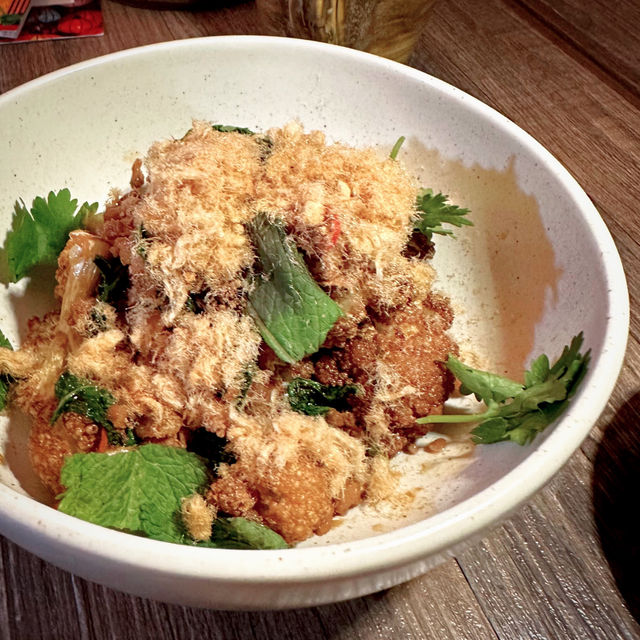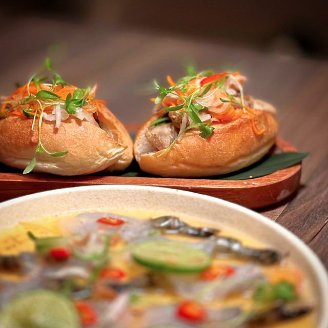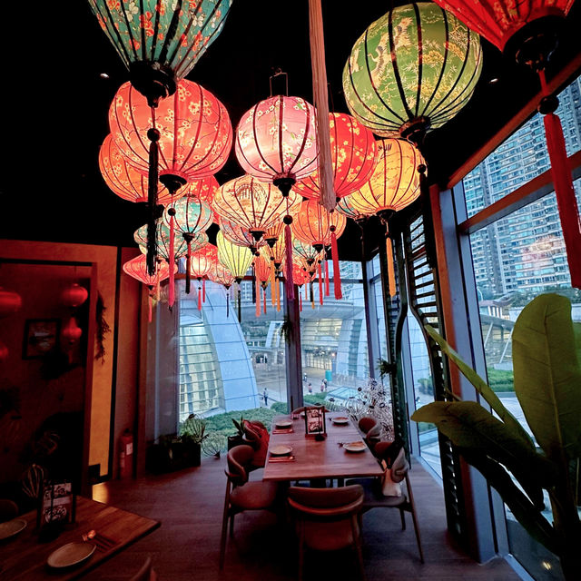 Rewinding to the Mid-Autumn Festival night, my wife and I, along with some friends, went to a beautiful place for dinner. We had a great time feasting and celebrating the festival. We chose Bistro Hoi An inside Elements! As the name suggests, this restaurant serves Vietnamese cuisine, but the decor inside is absolutely stunning. We spent almost half an hour just taking photos. From the ground floor to the staircase leading to the second floor, the place is adorned with atmospheric Vietnamese lanterns. Dining here during the Mid-Autumn Festival felt incredibly festive. We made a reservation for 6 PM, so there was still some daylight when we arrived, but the ambiance became even more enchanting as night fell. With such a great atmosphere, we had to pair it with a nice drink! This cocktail, called HANOI NIGHTS, is made with cocoa liqueur, Italian orange bitters, kumquat syrup, and tonic water. It had a refreshing kumquat aroma and was delightful to drink. The Vietnamese-style raw shrimp sashimi was incredibly fresh and had a nice, firm texture. Unlike the Thai version, it’s seasoned with kumquat fish sauce, which is savory and aromatic without being overly spicy—perfect for someone like me who can’t handle too much heat. The stir-fried minced meat with cauliflower was a pleasant surprise! The crispy cauliflower combined with dried shrimp, minced pork, and Thai basil was irresistibly flavorful. Even those who don’t usually like vegetables would fall in love with this dish. Both my wife and I are frog lovers, so we couldn’t resist ordering the stir-fried frog legs. The frog legs were cooked to perfection, tender and juicy, and seasoned with lemongrass, chili, and caramelized fish sauce, creating a harmonious blend of flavors. The Vietnamese pomelo and grilled shrimp salad featured fresh and succulent shrimp. The sweet and juicy pomelo, combined with crispy coconut shreds and mint leaves, made for a dish bursting with flavor. Ever since I tried a Michelin-starred Vietnamese baguette in Central, I’ve been hooked! The Vietnamese chicken sandwich here is equally impressive. The baguette is baked to a perfect crispness without being too hard to bite into. Inside, it’s filled with lemongrass chicken, foie gras pâté, pickled vegetables, and herbs. Every bite was incredibly satisfying. The stir-fried prawns with annatto and foie gras sauce sounded indulgent just from the name. The addition of annatto gave it a unique aroma, and the rich foie gras sauce was perfect for those who enjoy bold flavors. The signature egg curry with soft-shell crab was a standout! The curry sauce was so delicious, especially when paired with the accompanying baguette to soak it up. The fried soft-shell crab was also well-prepared—crispy and free of any fishy taste—but the curry sauce definitely stole the show. The Hoi An roasted suckling pig looked incredibly tempting! It’s served with homemade pickled vegetables, herbs, and lettuce, which you can wrap together to make it less messy. The suckling pig had crispy skin and flavorful meat, though the seasoning varied depending on the cut, giving everyone a unique taste experience. If you like spicy food, don’t forget to try their Sriracha seafood sauce—it’s very aromatic. My wife and I both loved the lemongrass and palm sugar roasted yellow chicken! The chicken was marinated to perfection, with tender and juicy meat. Don’t underestimate the accompanying cucumber—it was crisp and sweet, pairing wonderfully with the chicken. Worried we wouldn’t be full, we also ordered the signature crab fried rice to share! The fried rice included sausage, cabbage, chili, and herbs, creating a dish with layers of flavor that was incredibly appetizing. This rice dish is a winner. When it came to dessert, we tried the caramel popcorn banana! This dessert was a delightful mix of textures—sweet banana, crunchy popcorn, and cold Belgian caramel biscuit ice cream. It was absolutely delicious. Since one scoop of ice cream is never enough, we ordered an extra serving of homemade ice cream to share. It came with two scoops: coconut sorbet and Belgian caramel ice cream. Both flavors were fantastic, and the ice cream was incredibly smooth—definitely worth trying. Finally, for coffee lovers, there’s the Vietnamese espresso ice cream! The scoop of ice cream was also Belgian caramel-flavored, served with a drizzle of espresso and crunchy toppings. This dessert wasn’t quite to my taste, so I left it for the coffee enthusiasts to enjoy.