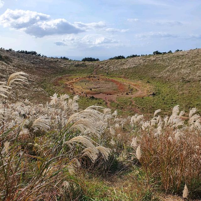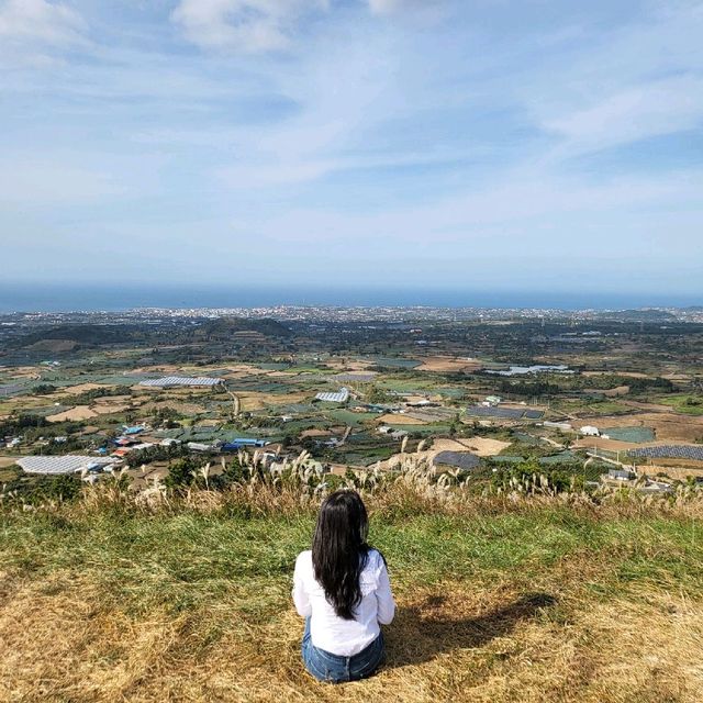 Jeju Geum Oreum, which was a bit exaggerated and looked like Switzerland ๐Ÿงก The wide open scenery is really beautiful, and the wide expanse of reeds is a work of art. It didn't rain on the day I went, so the peak was dry, but they say you can see a beautiful pond if you go after the rain :) #JejuTravel #SoloTravel #Geum Oreum