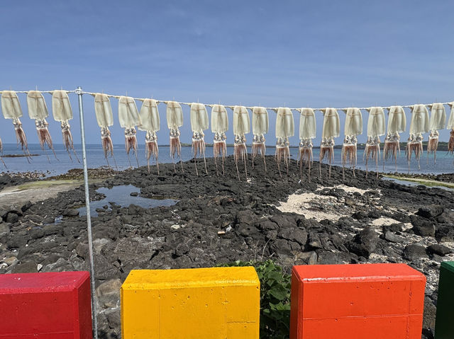 ~Jeju Island with Accusefive🍊~ Bidding farewell to the tranquil little fishing village, we headed to Udo for brunch (black bean noodles, seafood noodles, sweet and sour pork). Next, we strolled into the neighboring Udo Ice Cream Café, where the coral sand beach offered a super chill vibe and was perfect for photos. Honestly, I just wanted to lie there all day 🤣. At noon, I took off my shoes and stepped into the sea—still refreshingly cool—and with the gentle sea breeze, I completely forgot about the scorching summer! The coastal scenery was breathtakingly beautiful, making us stop frequently for photos and silly moments 🤪. We even turned into impromptu performance artists by the sea, pretending to be volcanic rocks—ha! The UNESCO World Heritage Site Seongsan Ilchulbong (Sunrise Peak) was stunning beyond words. However, we spent so much time relaxing on Udo that we missed the main attraction (Jeongbang Waterfall) and only managed to see the smaller Cheonjiyeon Waterfall 🤣. We then drove to Seogwipo's Daily Olle Market, but unfortunately, the elderly lady had already closed her stall, so we missed out on the tangerine rice cakes. Instead, we indulged in Jeju Island's grilled black pork, which truly lived up to its reputation with its amazing texture and flavor 😋. Under the moonlight, we finally arrived at tonight's Airbnb, "Forest," at 10:30 PM. The quality of this private villa instantly boosted our adrenaline—wow, it was stunning! The scent of wood throughout the house brought a sense of happiness ☺️. Sipping on Jeju Island's locally-produced canola flower soju and writing my travel journal, I couldn't help but smile as my lips curled up in joy!