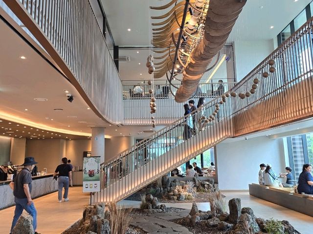 Nestled in the heart of Jeju's Fairy Tale Village, this place transcends the typical Starbucks experience, a space where art, nature, and sensibility coexist. Stepping inside, the soaring ceiling and the expansive view of Hallasan Mountain unfold before your eyes, refreshing your spirits. The tranquil kinetic artwork evoked anticipation for a truly unique experience. The Jeju-exclusive menu was exceptional, to say the least. The refreshing Grapefruit Mango Coco Frappuccino and the savory black sesame desserts perfectly captured the unique flavors of Jeju. Of course, as expected from a popular destination, lines are long and prices are steep, so be prepared. However, if you're looking to take your time, savor a cup of coffee, art, and nature, I highly recommend it. I hope this "healing cafe" on your Jeju trip will be just that for you. #DomesticTravel