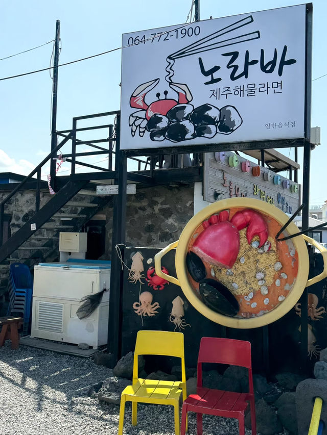 #seoulspots Noraba Seafood Ramen 🍜🌊 📍 270, Aewolhaean-Ro, Jeju, Jeju-do, South Korea 🕰️ 10:00–17:00 (Break 14:00–15:00), closed on Thursdays 🚕 Public transport doesn’t reach here, so best to grab a KakaoT taxi. From Jeju city, it’s about 13,400 KRW (~72 RMB). The set in the photo (🍜x2 + 🥤x2) came to 38,200 KRW (~205 RMB). If it’s busy, you’ll need to get a ticket at the entrance, otherwise you can go straight in and order. The ramen comes in two versions: standard and deluxe (with 🐙 and 🦀). You can also choose your spice level—we picked medium, which wasn’t too spicy. Don’t worry about the crab, they provide scissors ✂️ to make it easy! The flavor was absolutely worth the wait—been craving it for ages and it didn’t disappoint! Highly recommend sitting on the rooftop terrace with the view of the endless blue sea (just be prepared for strong winds!).