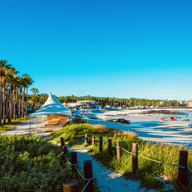 #hellohalloween Beyond being a daytime swimming destination, Geumneung Eutteumwon Beach is one of the best spots on Jeju for evening enjoyment, particularly for travelers interested in camping or glamping nearby. The open area near the beach is known for its accessibility and beautiful atmosphere, especially as the day ends. The sunset here is spectacular, with the sun dipping dramatically behind the silhouette of Biyangdo Island. This combination of natural beauty and suitability for camping creates a unique overnight experience, allowing you to wake up to the stunning turquoise waters right outside your tent flap.