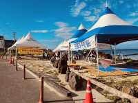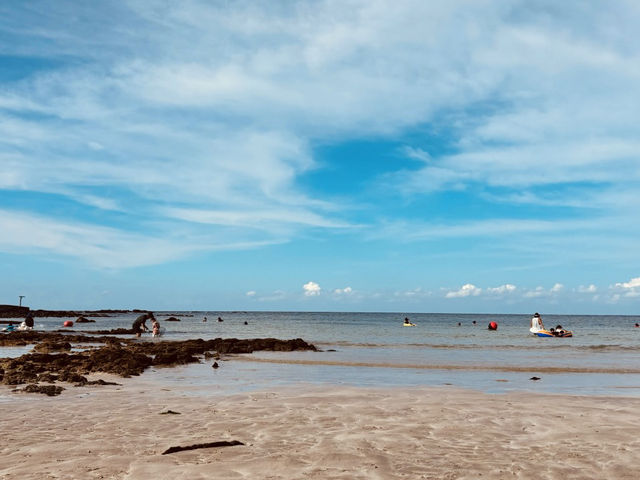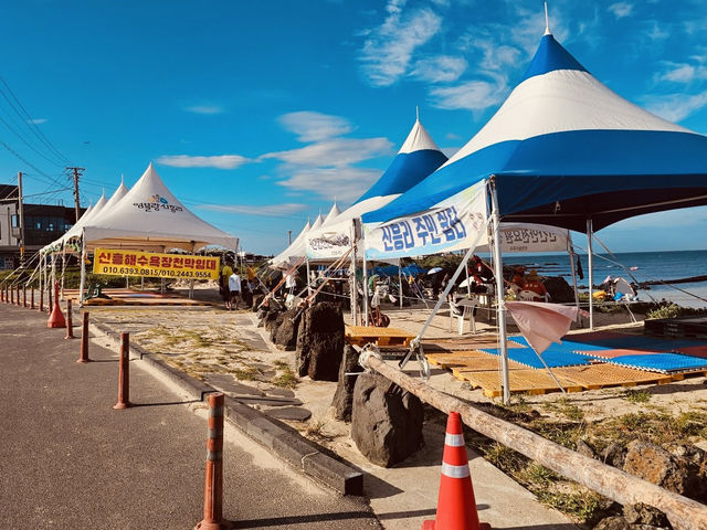 #hellohalloween A distinctive feature of Sinheung-ri Beach is the presence of a lovely pine forest (송림) situated directly behind the sand. This grove of trees provides crucial natural shade and a wonderfully fragrant, cool retreat from the midday sun. It's an ideal spot for setting up a picnic or simply relaxing on a blanket while still enjoying the sea breeze. This combination of beautiful sand, clear water, and a natural shaded area creates an appealing and comfortable environment for spending an entire day by the sea.
