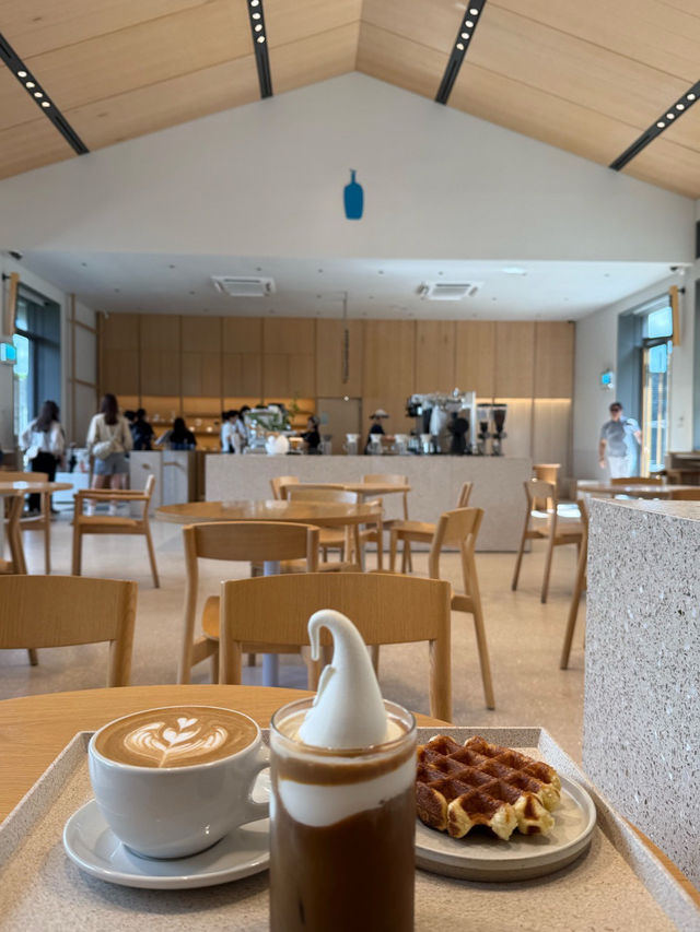 When visiting Jeju, many people tend to seek out seaside cafes, but enjoying coffee while gazing at the expansive fields and trees through large windows offers a unique and serene atmosphere๐ŸŒณโ˜•. The tranquil natural scenery, instead of the ocean, felt even more calming. On this day, I tried a cafe latte, Nola Float, and waffles. It was my first time tasting Blue Bottle coffee, and I found its overall flavor to be smooth and subtly aromatic, which I really liked๐Ÿ™‚. The Nola Float, in particular, left an impression with its softer and more delicate taste compared to Paul Bassett's ice cream latte๐Ÿจ. What stood out the most was the beautifully designed interior and the harmonious outdoor landscaping, which made enjoying a cup of coffee feel even more leisurely. As expected, Blue Bottle in Jeju has a unique charm๐Ÿƒ. It's a quiet and delightful space to visit! โฐBusiness Hours Daily 08:00 - 19:00 ๐Ÿ“Blue Bottle Jeju Cafe 2133-30 Beonyeong-ro, Gujwa-eup, Jeju-si, Jeju