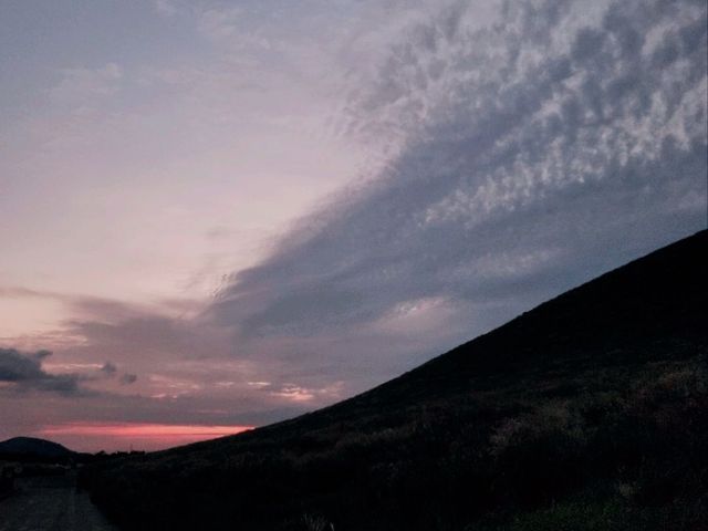 I went once on a sunny day It was like a regular big hill I went another time when the sun was setting Looking at the sunset between the horizon of the sea and the hills It was a lonely atmosphere, but I felt that the presence of my family next to Sesam was precious Instead, when you go down, I recommend going down faster than anyone else Because there is no light around! #Jejudo #Oreum #SebyeolOreum #Sunset #JejuSunset