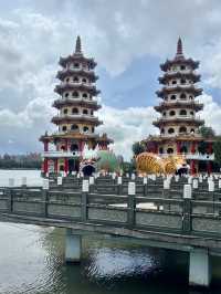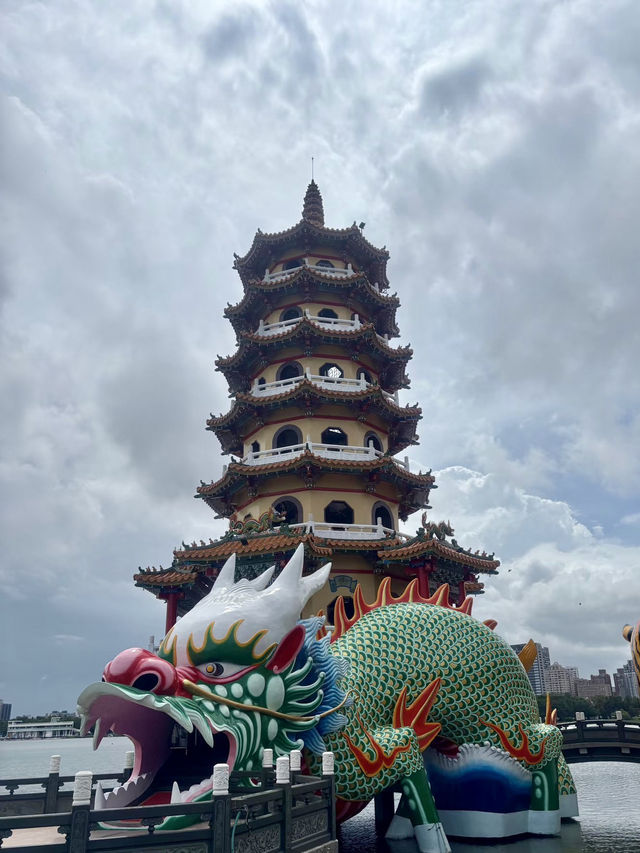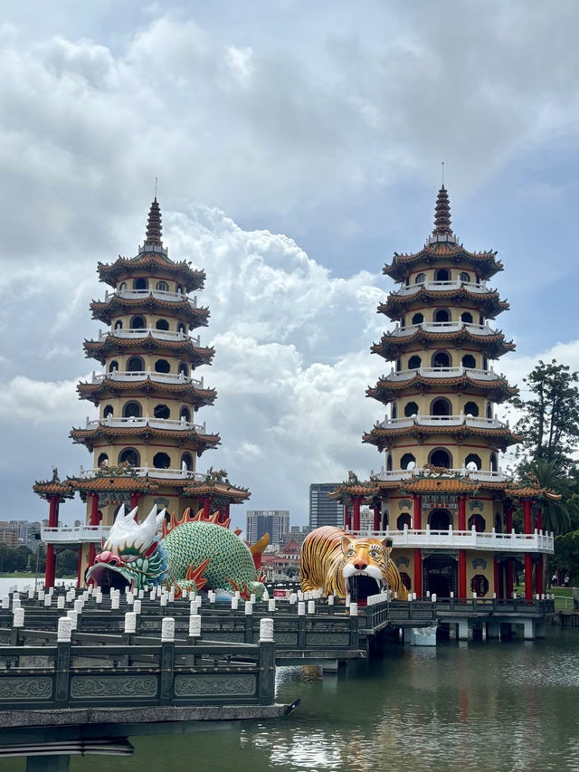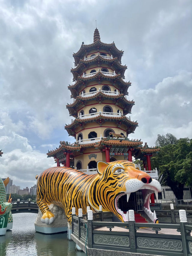 The Dragon and Tiger Pagodas by Lotus Pond are one of the most iconic landmarks in Kaohsiung. As you approach along the lakeside, the seven-story towers reflect on the water, resembling two gates guarding the city. According to local legend, entering through the dragon's mouth and exiting through the tiger's mouth symbolizes driving away bad luck and welcoming good fortune. Following the custom, I walked through the path and silently made a wish in my heart. Inside the pagodas, vibrant murals depict Buddhist stories and folk legends, inviting visitors to read and reflect as they walk. Climbing to the top of the pagodas, the entire Lotus Pond glistens under the sunlight, with a gentle breeze carrying the coolness of the water, dispelling the summer heat. The Dragon and Tiger Pagodas are not just a photo-worthy spot but also an intimate dialogue with traditional culture.