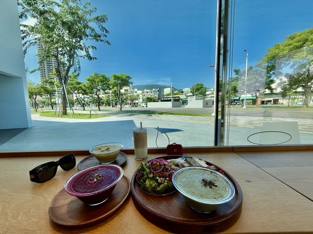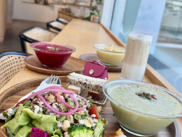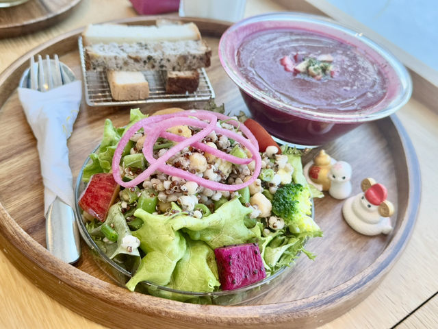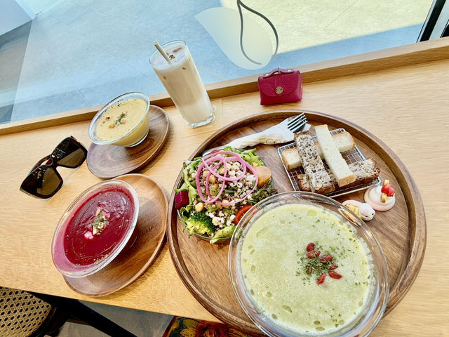 Today I went to SO_UP, a light food restaurant inside the Neiwei Art Center in Gushan District, Kaohsiung. It's perfect for a weekend stroll or a movie. The all-white design of the Neiwei Art Center is also perfect for photo ops! SOUP serves brunch from 8:00 AM to 5:00 PM. The staff are young, attractive, and friendly. I ordered a set menu with two soups. (Very Sponge Gourd Soup) Sponge Gourd, onion, shimeji mushrooms, and white fungus. (Corn, Rice, and Wheat Soup) Corn, oat milk, onion, carrot, garlic sprouts, and vegetable broth. (Beetroot and Apple Soup) Beetroot, apple, onion, tomato, eggplant, and celery. All very healthy. I finished three bowls of soup by myself. My favorites: the yellow (corn) for its texture, the green (sponge gourd) for its aroma, and the red (beetroot) for its nutrition. This is a great vegetarian restaurant and highly recommended.