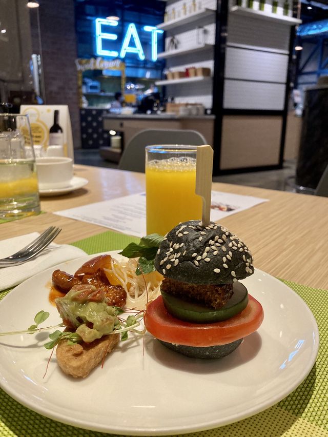 It's so special~ This time I went to Eat@ease for a buffet. I didn't expect that there is also a new vegetarian meat area😍 The choice is rich, and it's also very surprising! 。 The most special must be the mini 🍔 bamboo charcoal vegetarian beef burger! 。 Thai Vegetarian Minced Meat Vermicelli Clover Salad, with the addition of Clover, the salad is not only fresh, but also has different levels of fragrance. 。 Crispy fried vegetarian chicken pieces with avocado 🍅 tomato salsa. 。 Grilled vegetarian chicken strips with sweet and sour sauce, 😙 Sweet and sour sauce is sweet and sour, very appetizing. #local tour #parent-child travel guide #cafe #foodie #summer food recommendations #affordable hotels #summer places #buffet strategies