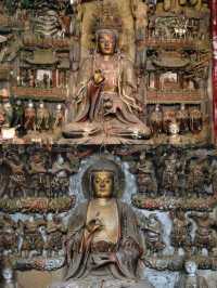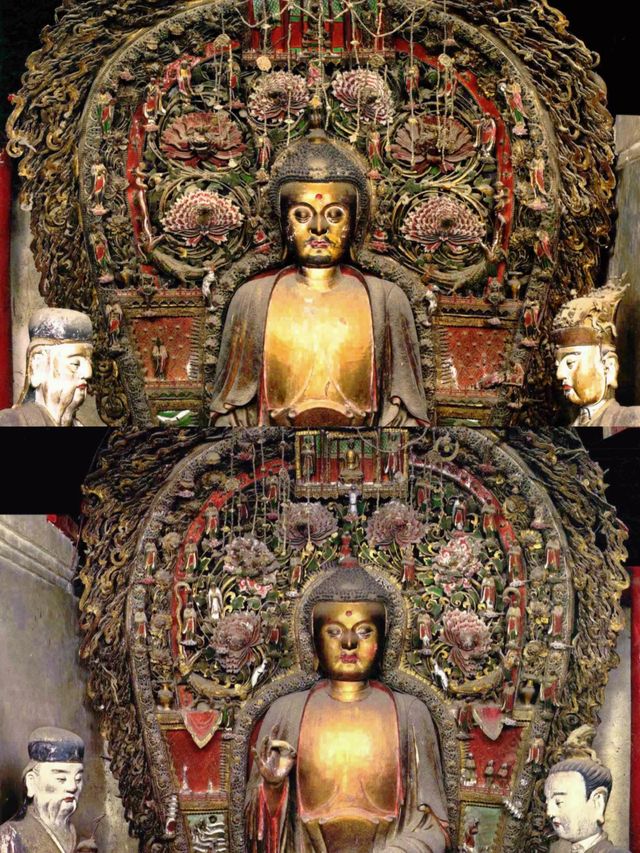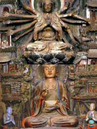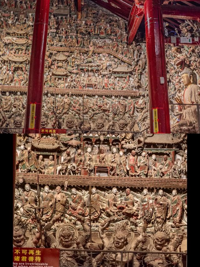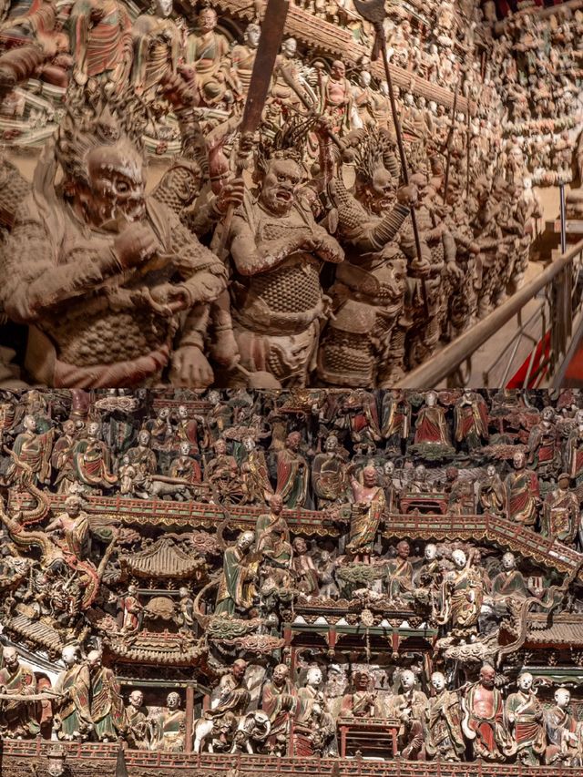 Finally I went to the famous Lantian Shuilu Temple, which is less than an hour's drive from downtown Xi'an. I highly recommend it. · So far I have seen 👇 four famous hanging sculptures: 👉 Lantian Shuilu Temple, Xi'an, Shaanxi 👉 Xiaoxitian in Xi County, Linfen, Shanxi 👉 Pingyao Shuanglin Temple, Jinzhong, Shanxi 👉 Changzhi Guanyin Temple, Changzhi, Shanxi · Among these four hanging sculptures, I personally think that the best one in terms of overall sculpture is Shuilu Temple; the most breathtaking one in terms of scene is Xiaoxitian Temple; and the most amazing ones in Shuanglin Temple are Wei Tuo, the Four Vajras and the hall of arhats. So if you go to Xi'an, I highly recommend you to visit Shuilu Temple. · 🌈 Lantian Shuilu Temple, Ming Dynasty 📝 The fourth batch of national key cultural relics protection units 📍 Lantian County, Xi'an, Shaanxi · Shuilu Temple was originally part of the Wuzhen Temple of the Sui Dynasty. The Guanzhong earthquake in December of the 34th year of the Jiajing reign of the Ming Dynasty (1556) caused Mount Zhongnan to move several miles south, and the lower temple of Wuzhen Temple at the foot of the mountain suffered devastating damage. · In the 42nd year of the Jiajing reign (1563), Zhu Yuanzhang's ninth-generation grandson, Zhu Huaishen, the King Xuan of Qin, invited craftsmen from Shanxi, such as Qiao Zhongjie, to rebuild the Shuilu Temple as a Buddhist temple for his mother to worship Buddha. This is how the hanging sculpture we see today came into being. · There are twelve colored sculptures on each of the north and south gables in the Shuilu Temple. Some people believe that they are the Twenty-Four Deities, some say they are two groups of the Twelve Generals of Medicine Buddha, and some say they are two groups of the Ten Great Vidyarajas plus folk gods. But no matter who they are, in these twenty-four colored sculptures we can see the shadows of the Twenty-Four Deities of the Iron Buddha Temple in Gaoping, Shanxi that we posted before. Considering that the statues in this hall of Shuilu Temple were also made by Shanxi craftsmen in the Ming Dynasty, they can be said to be of the same origin. · Reference: "Social Life in the Ming Dynasty as Seen from Shuilu Temple in Lantian, Shaanxi", Yang Binghua · Lantian Shuilu Temple Wall Sculpture Museum